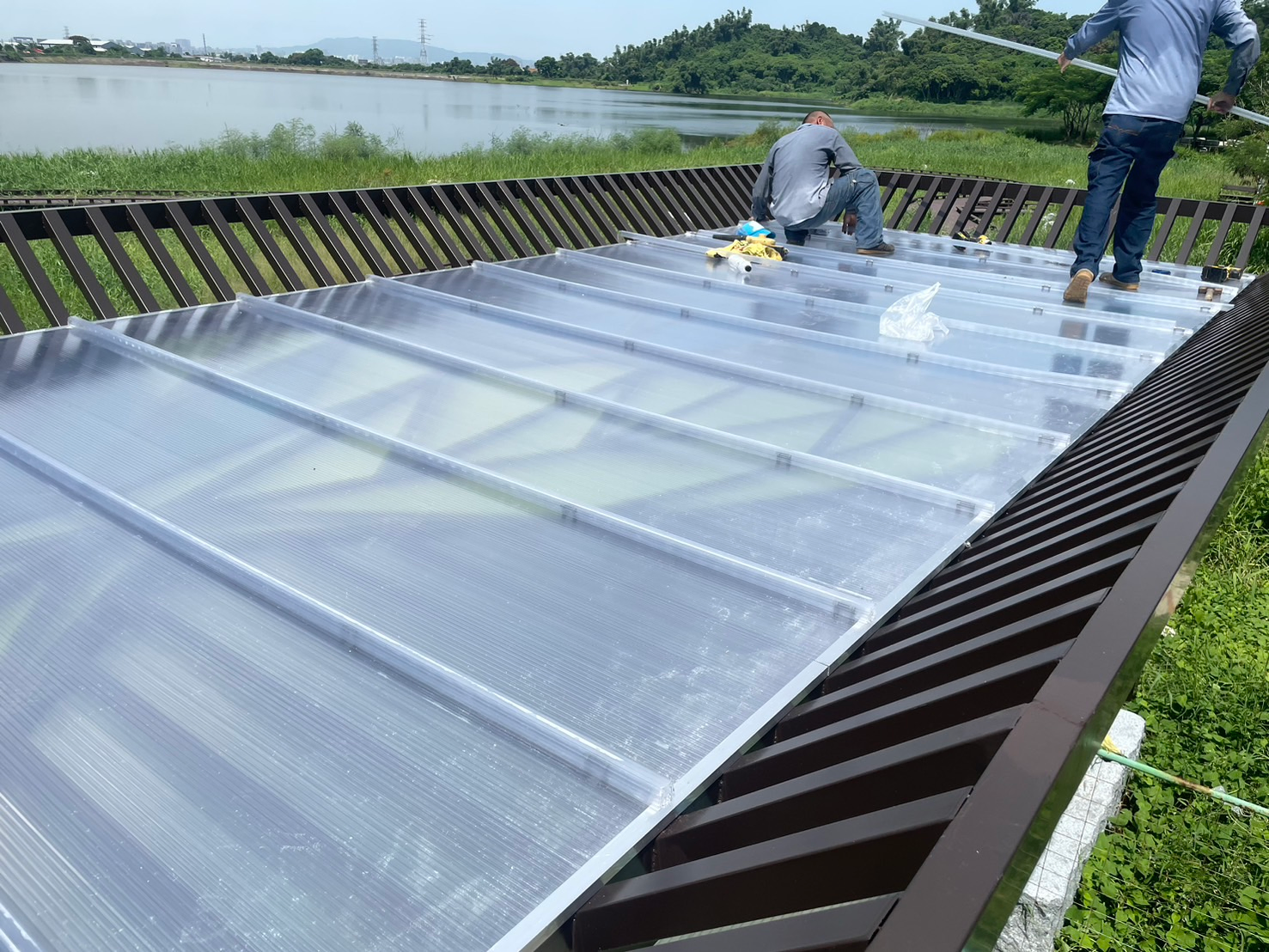 業主使用扣合式PC中空板(16mm厚度),搭配PC扣壓條,以達到均勻採光隔熱遮陽效果,並且因為扣合式設計,有效達到防漏與快速排水